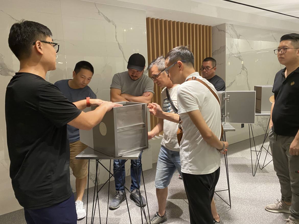 在接下來的活動中,設(shè)計師朋友們跟隨著庫靈圖展廳參觀的動線,逐步了解了各類不銹鋼廚柜、陽臺柜等產(chǎn)品和工藝細(xì)節(jié)。R角一體壓模成型、蜂窩鋁+環(huán)保發(fā)泡復(fù)合填充等專屬于庫靈圖的獨家工藝技術(shù),以及各類人性化設(shè)計細(xì)節(jié)和時尚外觀,讓設(shè)計師們倍感興趣,好評不斷。